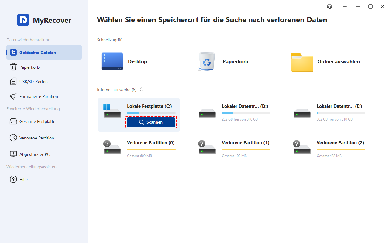 MyRecover ist eine zuverlässige und benutzerfreundliche Wiederherstellungssoftware, mit der Sie gelöschte oder verlorene Dateien von verschiedenen Speichermedien wiederherstellen können, darunter auch OneNote-Notizbücher, sofern diese einmal lokal gespeichert wurden. Ob der Datenverlust durch versehentliches Löschen, Formatieren oder Systemabstürze verursacht wurde – MyRecover scannt Ihr Laufwerk und findet wiederherstellbare OneNote-Dateien.