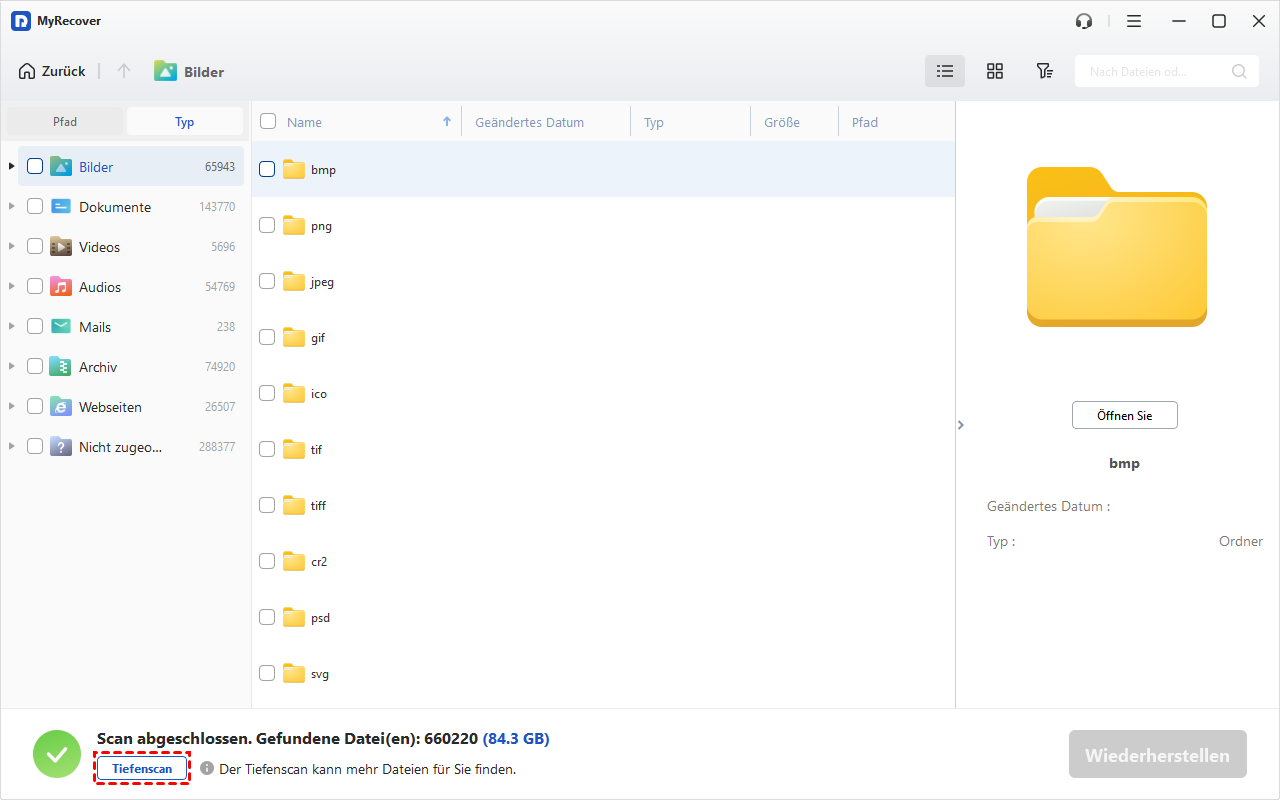 Schritt 3: MyRecover führt automatisch einen Schnellscan durch. Wenn der Schnellscan Ihre verlorenen Dateien nicht findet, können Sie manuell einen Tiefenscan durchführen.
