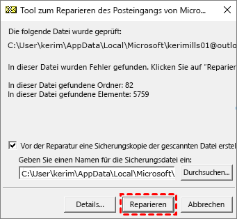 Schritt 3. Klicken Sie auf „Reparieren“, um die beschädigte PST-Datei zu reparieren. Starten Sie Outlook nach Abschluss der Reparatur neu.