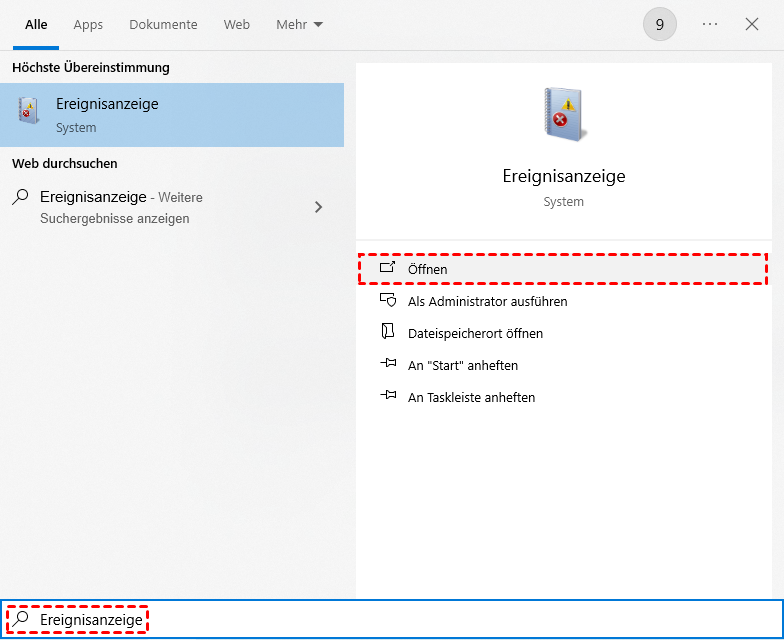 Schritt 1. Geben Sie in der Windows-Suche „Ereignisanzeige“ ein und öffnen Sie sie.