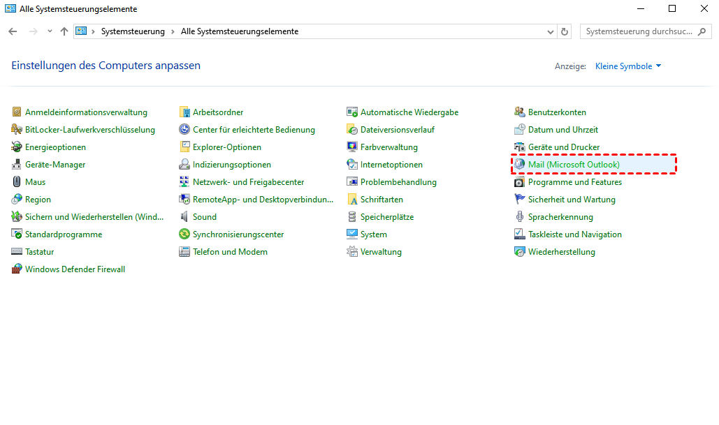 Schritt 1. Öffnen Sie die Systemsteuerung und wählen Sie „Mail(Microsoft Outlook)“ . Wenn Sie die hierarchische Ansicht anstelle der alphabetischen Listenansicht verwenden, klicken Sie zuerst auf „Benutzerkonten“, bevor Sie „Mail(Microsoft Outlook)“ auswählen.