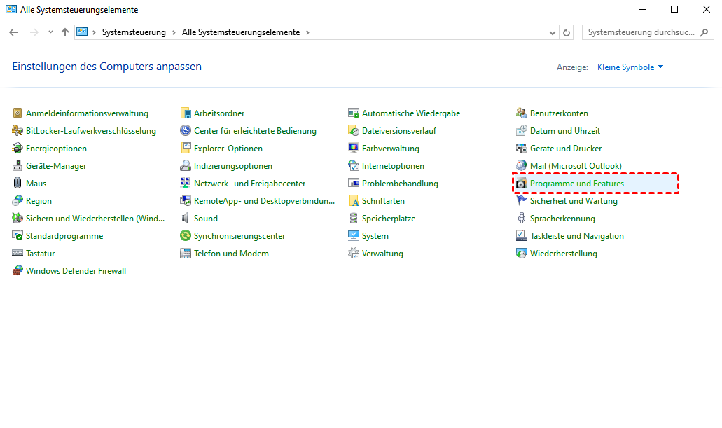 Schritt 2. Öffnen Sie die Systemsteuerung und wählen Sie „Programme und Features“. Wenn Sie die hierarchische Ansicht anstelle der alphabetischen Listenansicht verwenden, klicken Sie zuerst auf „Programme“, bevor Sie „Programme und Features“ auswählen.