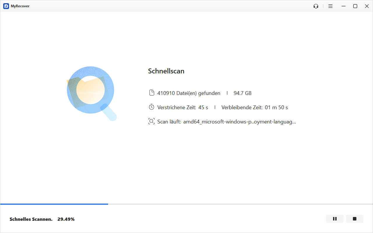 Schritt 3. MyRecover unterstützt zwei Scanmodi. Normalerweise führt das Programm zunächst automatisch einen Schnellscan durch, um kürzlich verlorene oder gelöschte Dateien zu finden. Werden keine Dateien gefunden, können Sie einen Tiefenscan durchführen.