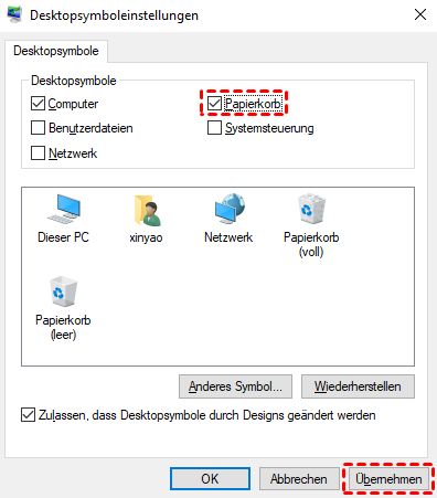 Gehen Sie zu Personalisierung > Designs > Desktopsymboleinstellungen, aktivieren Sie „Papierkorb“ und klicken Sie auf OK, um die Anzeige wiederherzustellen.