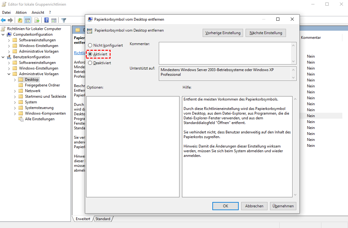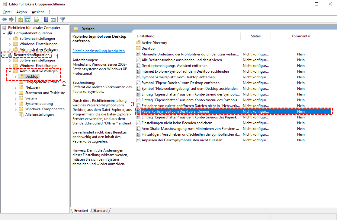 Methode 4. Papierkorb verstecken über Gruppenrichtlinie