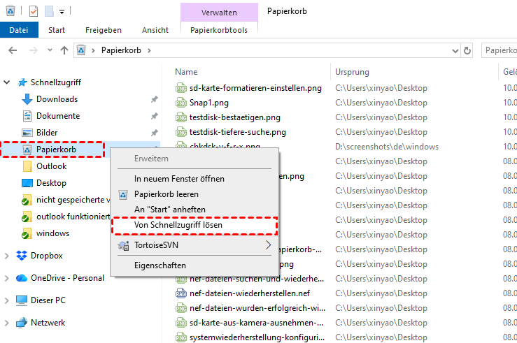 Öffnen Sie den Datei-Explorer, geben Sie „Papierkorb“ in die Adressleiste ein, klicken Sie mit der rechten Maustaste und wählen Sie „An Schnellzugriff anheften“. Der Papierkorb wird dann im Schnellzugriffsbereich auf der linken Seite angezeigt. Bei manchen Systemversionen ist das Anheften per Rechtsklick nicht möglich, in diesem Fall funktioniert jedoch das Verschieben per Drag & Drop.