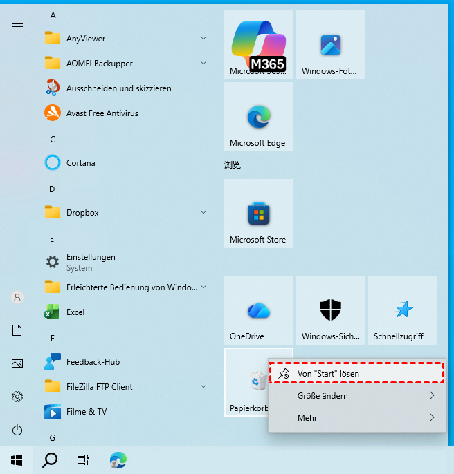 Um den Papierkorb aus dem Startmenü zu entfernen, können Sie ihn zunächst lösen. Beachten Sie jedoch, dass der Papierkorb nicht auf allen Systemen standardmäßig im Startmenü angezeigt wird.