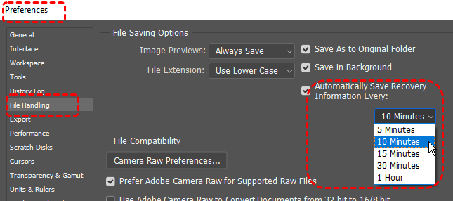 Starten Sie Photoshop und gehen Sie zu „Bearbeiten > Voreinstellungen > Dateiverwaltung“. Aktivieren Sie dann „Wiederherstellungsinformationen automatisch speichern alle…“ und legen Sie die Speicherdauer je nach Bedarf auf 5, 10, 15, 30 Minuten oder 1 Stunde fest.