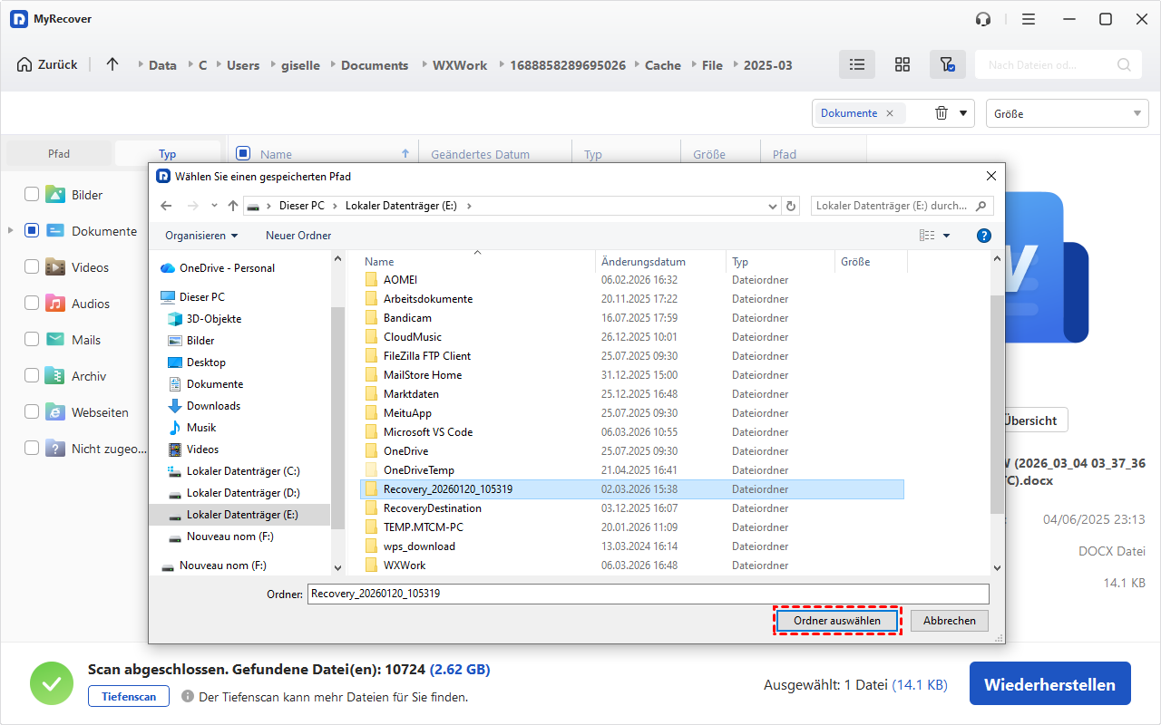 Daten suchen oder filtern: Geben Sie den Datentyp „Dokumente“ an, um den Filterbereich einzugrenzen. Für bestimmte Dateien oder Ordner geben Sie den Namen oder die Erweiterung in das Suchfeld ein, um die Ergebnisse einzugrenzen. Zudem können Sie die Größe (512 KB, 512 KB~10 MB, 10 MB~ 100 MB, 100 MB~ 512MB, 512 MB~ 1GB, über 1 GB usw.) festlegen.