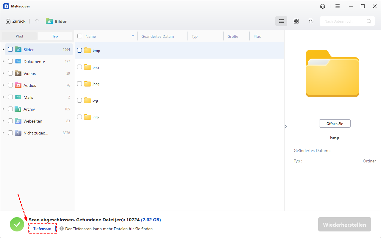 MyRecover kann die ausgewählte Karte automatisch scannen, um alle wiederherstellbaren Dateien zu finden. Der Schnellscan sucht nach kürzlich gelöschten Dateien, während der Tiefenscan nach anderen fehlenden Dateien sucht.