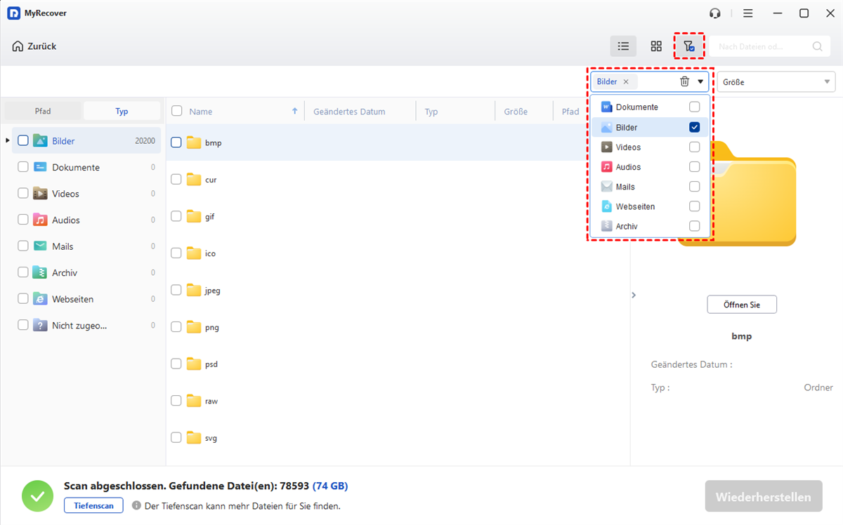 Schritt 4: Sie können wiederherstellbare Dateien nach Typ (Fotos/Dokumente/Videos) durchsuchen und die Such-/Filterfunktionen nutzen, um bestimmte Dateien zu finden.