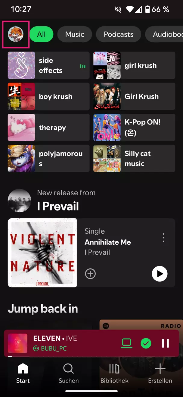 Schritt 1. Öffnen Sie die Spotify-App auf Ihrem Smartphone und tippen Sie oben links auf Ihr Profilbild.