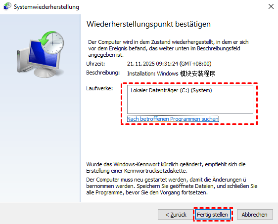 Schritt 5: Klicken Sie auf „Weiter“ > „Fertig stellen“, um die Wiederherstellung zu starten. Ihr PC wird neu gestartet und auf den ausgewählten Zustand zurückgesetzt.