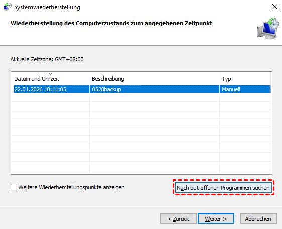 Schritt 3: Klicken Sie auf „Weiter“ und wählen Sie einen Wiederherstellungspunkt aus der Liste.