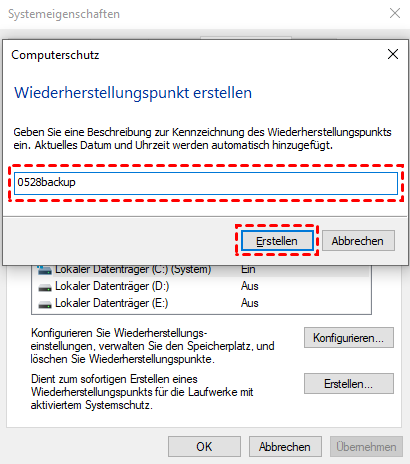 Schritt 3: Benennen Sie den Wiederherstellungspunkt und bestätigen Sie.