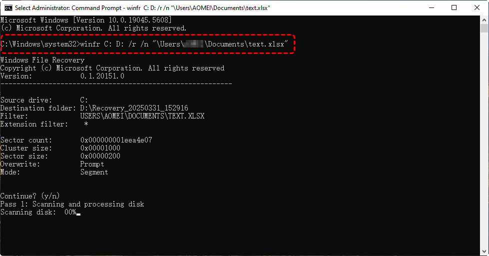 Schritt 3. Verwenden Sie die folgende Syntax: winfr Quelllaufwerk: Ziellaufwerk: /n \Pfad\zur\Datei. Um von Windows Defender gelöschte Dateien wiederherzustellen, fügen Sie /r für den Segmentwiederherstellungsmodus hinzu.