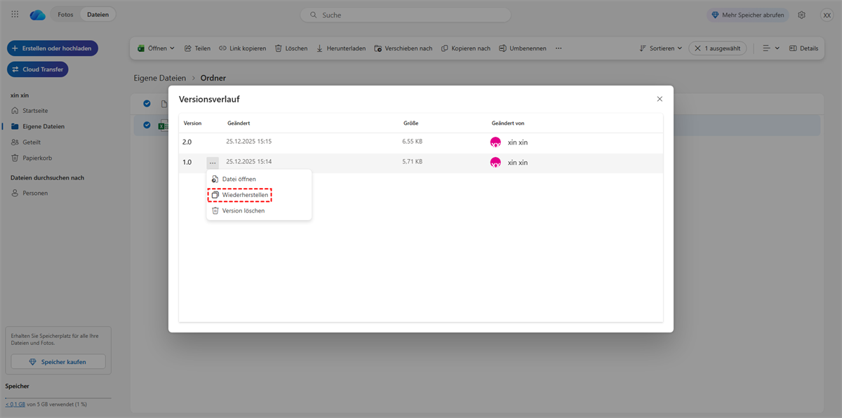 Schritt 4: Sobald Sie die gewünschte Datei gefunden haben, wählen Sie „Wiederherstellen“, um eine zuvor gespeicherte Version wiederherzustellen.