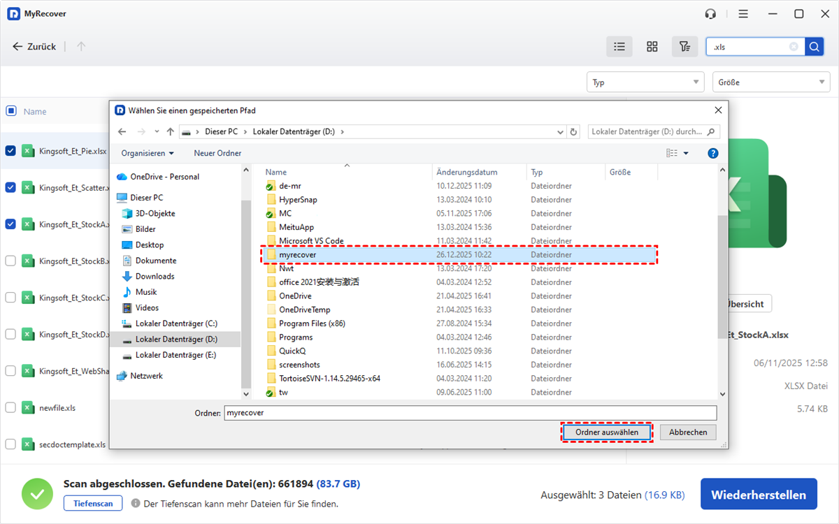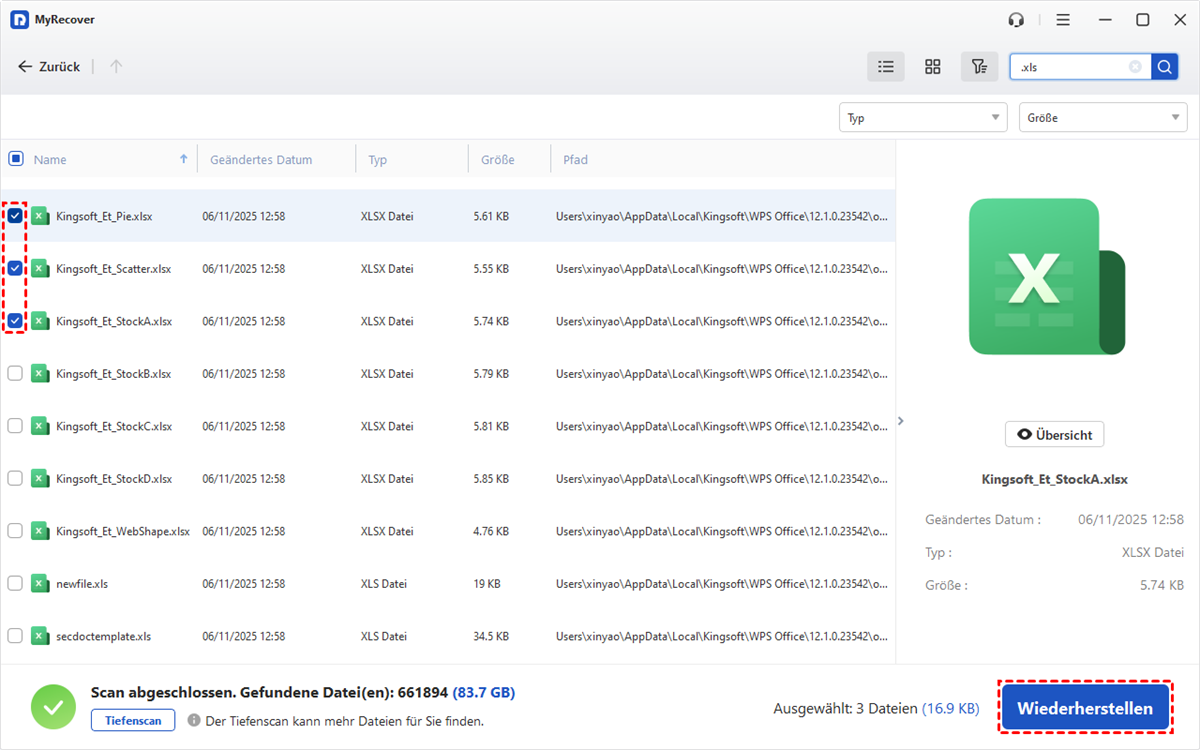 Schritt 5. Markieren Sie die gewünschten Excel-Dateien, klicken Sie auf „Wiederherstellen“ und wählen Sie einen sicheren Speicherort.