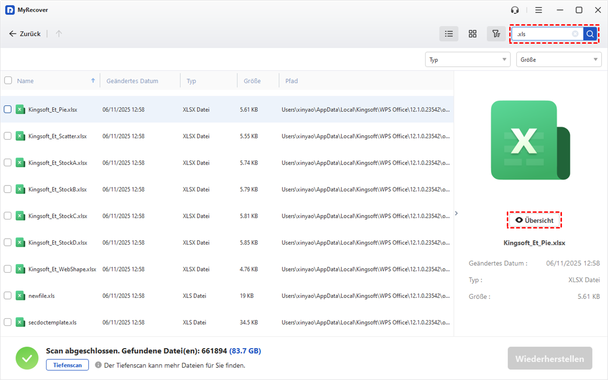 Schritt 4. Wählen Sie die gelöschte Excel-Datei aus (filtern Sie nach dem Format .xlsx/.xls) und sehen Sie sich bei Bedarf eine Vorschau an.