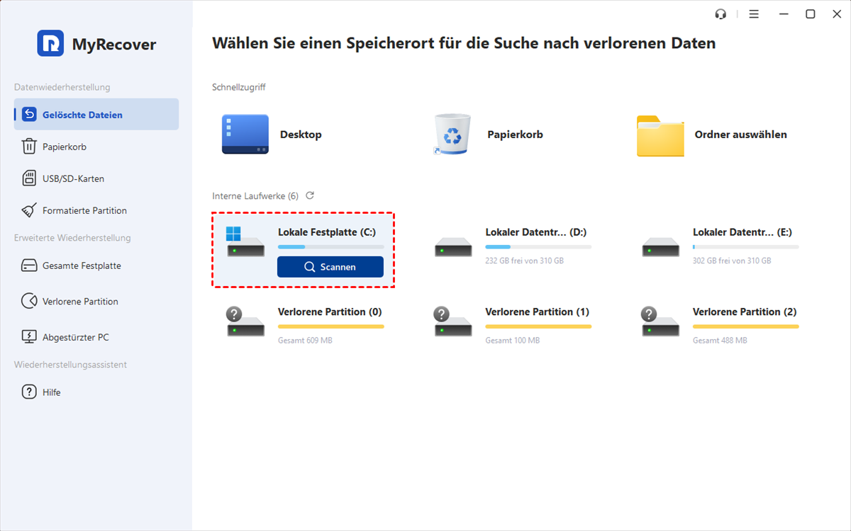 Schritt 2. Starten Sie MyRecover und wählen Sie das Laufwerk aus, auf dem Ihre Excel-Datei gespeichert war. Klicken Sie auf „Scannen“.