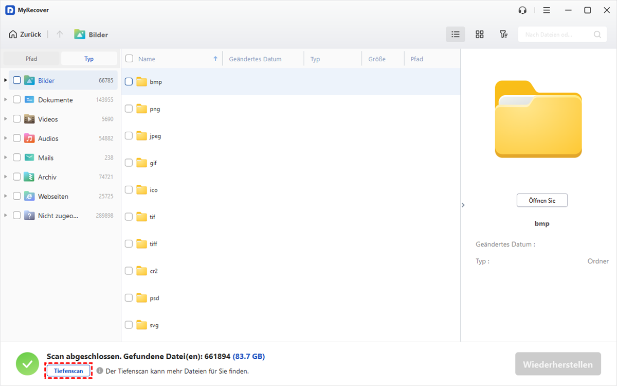 Für schwerwiegendere Fälle – wie das endgültige Löschen oder beschädigte Dateien – bietet MyRecover eine zuverlässige Lösung mit Tiefenscan und umfassender Dateiformatunterstützung. Um Dateien auf beliebig vielen Geräten mit verbesserter Unterstützung wiederherzustellen, können Sie die Technician Edition testen.