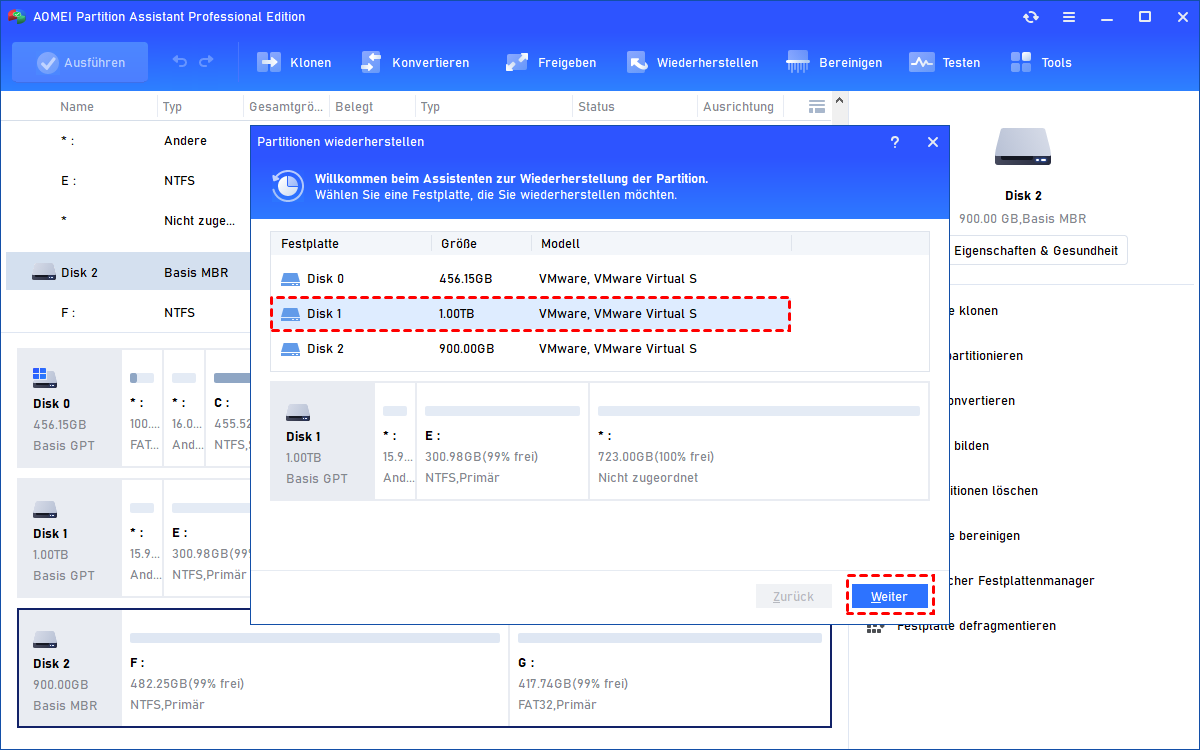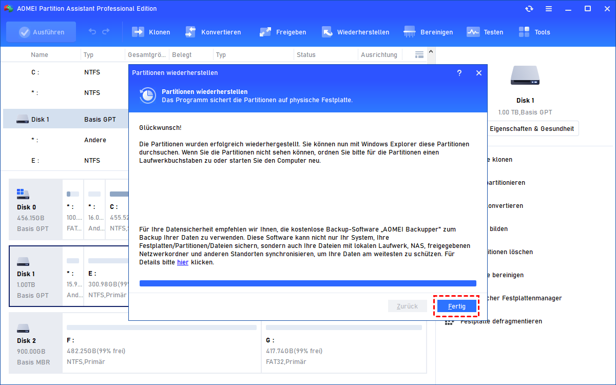 ✔ Stellt gelöschte Partitionen mit ihren intakten Daten wieder her (sofern die Daten nicht überschrieben wurden).