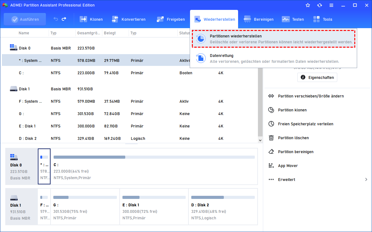 Eine der schnellsten Möglichkeiten, ein fehlendes Laufwerk D wiederherzustellen, ist die Verwendung zuverlässiger Partition-Wiederherstellungssoftware. AOMEI Partition Assistant ist ein sehr empfohlenes Tool für diesen Zweck, dank seiner leistungsstarken Funktionen und Benutzerfreundlichkeit.