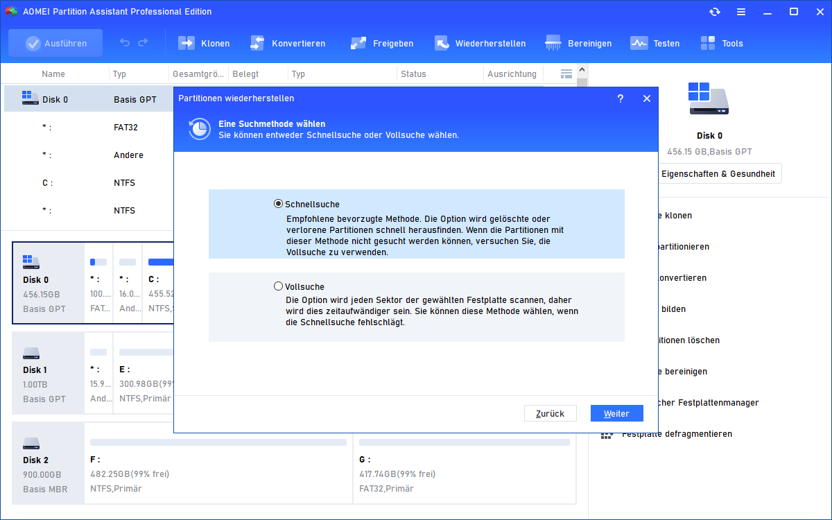 ✔ Bietet Benutzern 2 Scan-Methoden, um gelöschte oder verlorene Partitionen leicht zu finden.