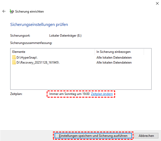 6. Klicken Sie abschließend auf „Einstellungen speichern und Backup ausführen“.