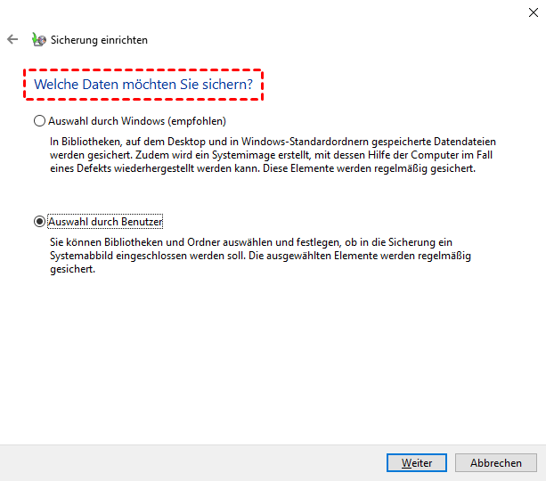 - Auswahl durch Windows (Standard: Sicherung von Bibliotheken, Desktop und Systemdateien).