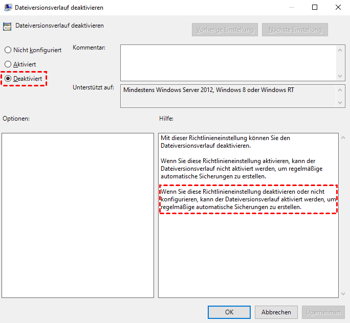 Lösung 4. Gruppenrichtlinienkonfiguration für den Dateiverlauf überprüfen