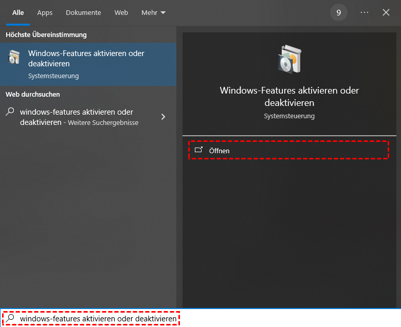 1. Drücken Sie gleichzeitig die Windows-Taste + S und geben Sie „Windows-Features aktivieren oder deaktivieren“ ein. Klicken Sie unter dem entsprechenden Suchergebnis auf „Öffnen“.