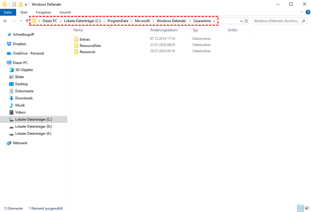 Von Windows Defender unter Quarantäne gestellten Dateien werden von ihrem ursprünglichen Speicherort entfernt und unter folgendem Pfad gespeichert: C:\ProgramData\Microsoft\Windows Defender\Quarantine. Sie können diese Dateien nur über das Windows-Sicherheitscenter anzeigen und verwalten.