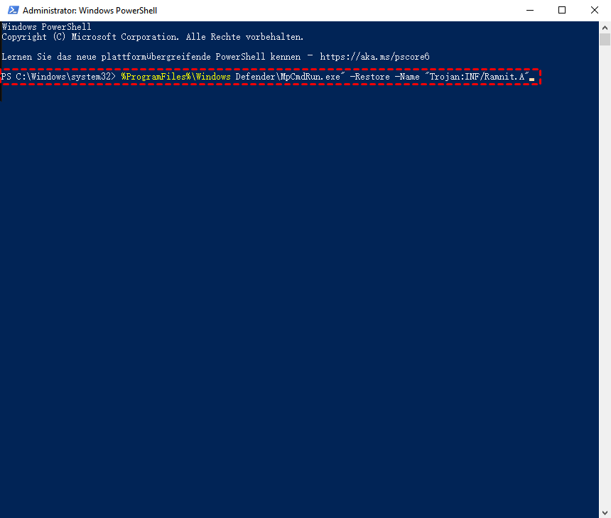 - Ersetzen Sie „Name“ durch den genauen Namen der unter Quarantäne gestellten Datei, die Sie wiederherstellen möchten (Sie können dies unter Windows-Sicherheit > Schutzverlauf überprüfen).