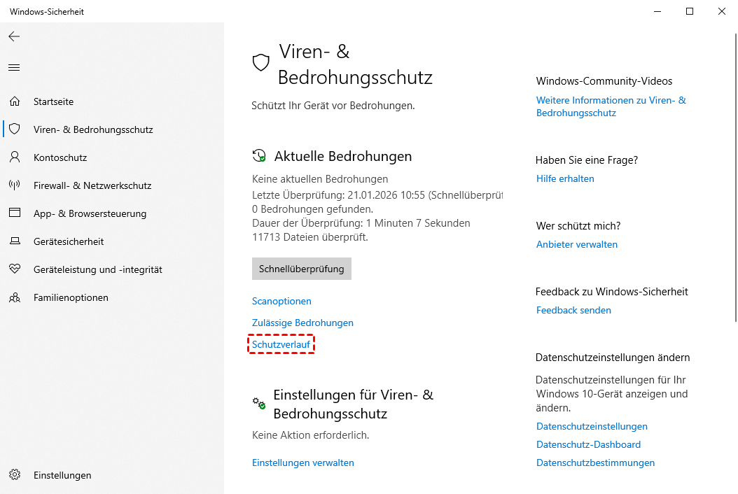 Schritt 2: Klicken Sie auf „Viren- und Bedrohungsschutz“ und wählen Sie unter „Aktuelle Bedrohungen“ die Option „Schutzverlauf“.