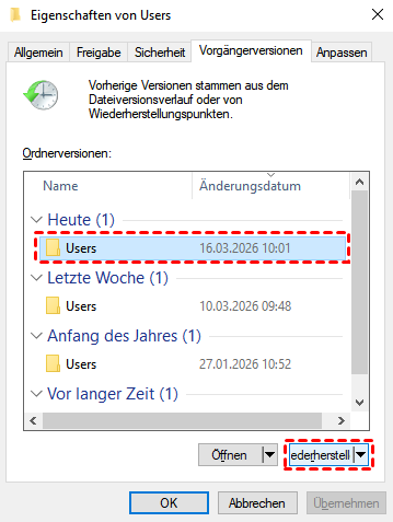 Methode 3. Gelöschte Benutzerprofile wiederherstellen über Vorgängerversionen
