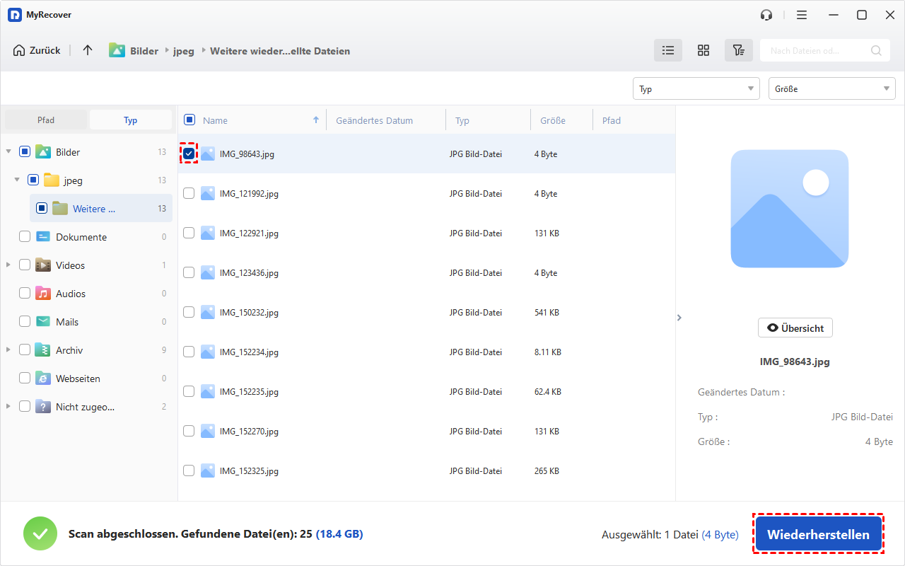 MyRecover ermöglicht Ihnen das Filtern und Vorschauen Ihrer Dateien mit drei praktischen Optionen: