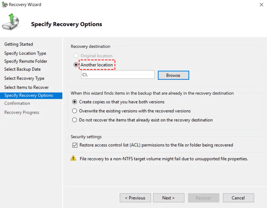 Sie können auch Windows Server Backup verwenden, um bestimmte Dateien und Ordner aus darin enthaltenen Sicherungsabbildern wiederherzustellen. Bitte stellen Sie sicher, dass die Sicherungsfunktion aktiviert ist. Sie müssen Windows Server Backup manuell installieren.