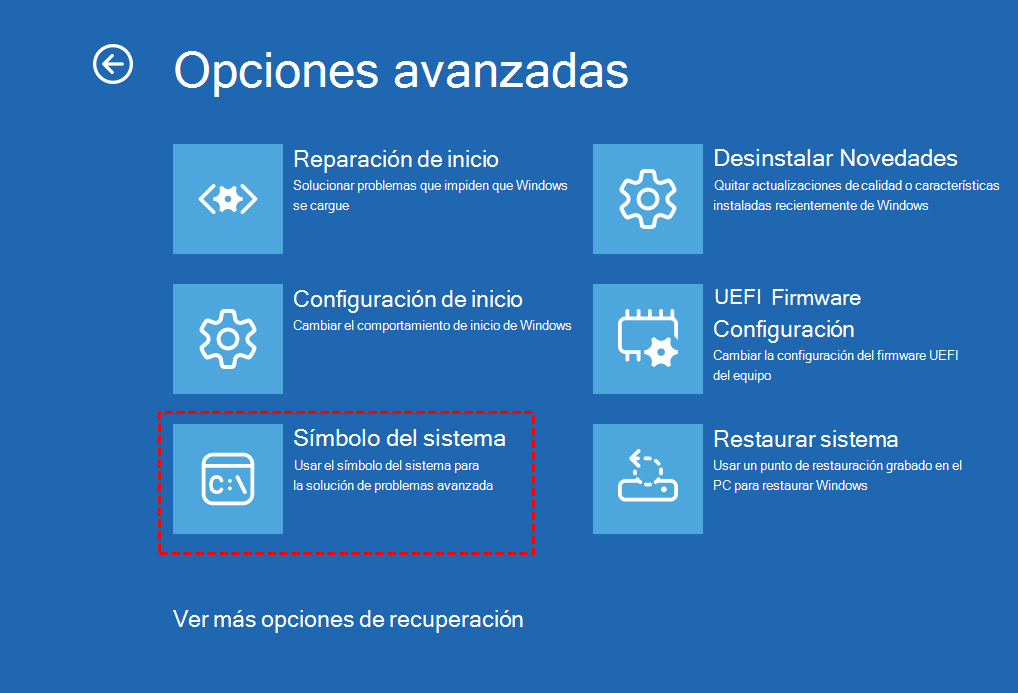 Interrumpa el arranque tres veces seguidas (forzando el apagado durante la carga de Windows) para activar WinRE. También puede iniciar desde un medio de instalación de Windows (USB/DVD) y elegir Reparar el equipo → Solucionar problemas → Opciones avanzadas → Símbolo del sistema.