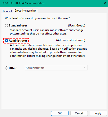 Step 6: Ensure Administrator is selected.