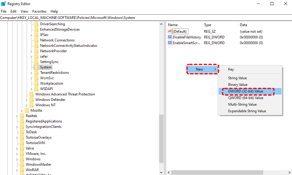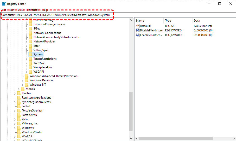 HKEY_LOCAL_MACHINE\SOFTWARE\Policies\Microsoft\Windows\System