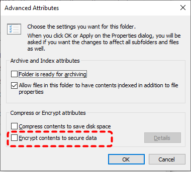 Step 3. Click "Advanced", check if the "Encrypt contents to secure data" is selected. If it is, you may encounter the "Invalid MS-DOS Function" or "Access Denied" error when copying the file to a FAT32 or exFAT drive.