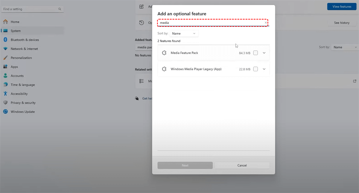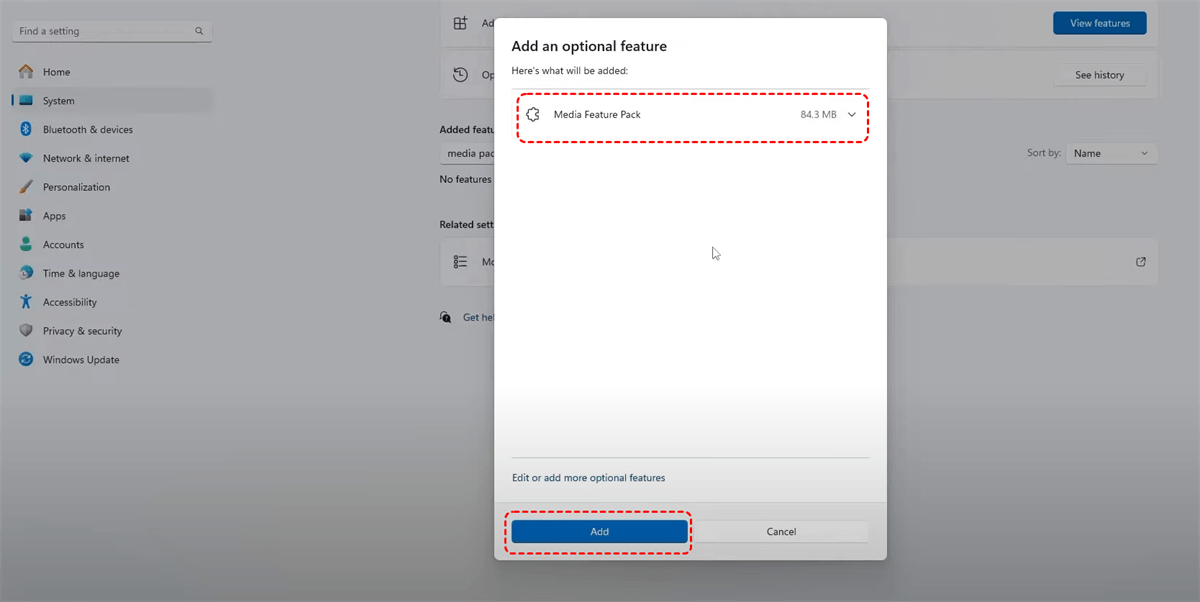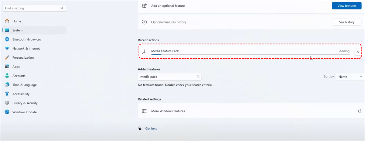 Step 2. Click "Add an optional feature", then select "View features". Search for "Media Feature Pack" in the list.