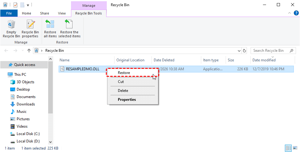 Open the Recycle Bin from the desktop or File Explorer. Look for a file named ResampleDmo.DLL. You can use the search bar at the top-right corner to find it quickly.If the file is found, right-click → Restore. This will return it to its original location.