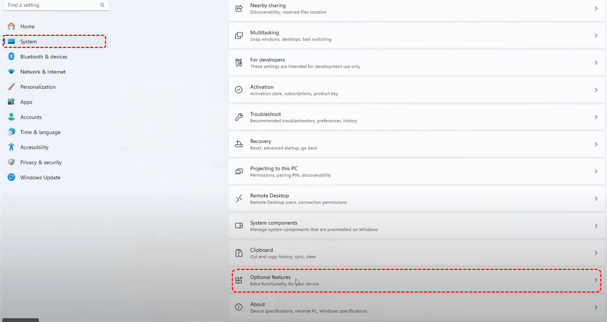 Step 1. Open Settings (press "Win + I") and go to "System→ Optional features".