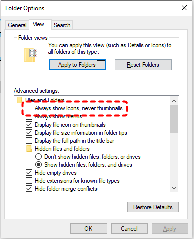 Step 2. Under the "View" tab, check the box of "Always show icons, never thumbnails".