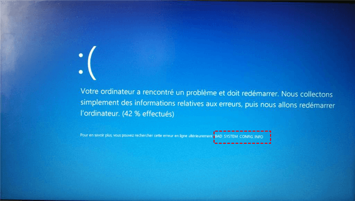 Depuis hier, mon ordinateur portable fonctionnait parfaitement, sans écran bleu. Cependant, j'avais des difficultés à me connecter à Internet, car mon réseau n'apparaissait pas dans la barre d'adresse. J'ai essayé de résoudre ce problème en suivant des tutoriels sur YouTube, mais sans succès. J'ai abandonné hier, espérant trouver une solution aujourd'hui, mais au lieu de cela, en allumant mon ordinateur, j'ai eu un écran bleu avec le code d'arrêt : « BAD_SYSTEM_CONFIG_INFO ». De plus, impossible d'accéder au mode sans échec, car l'ordinateur affiche systématiquement un nouvel écran bleu. Je suis bloqué. Quelqu'un pourrait-il m'aider ou me donner des conseils pour résoudre ce problème ?