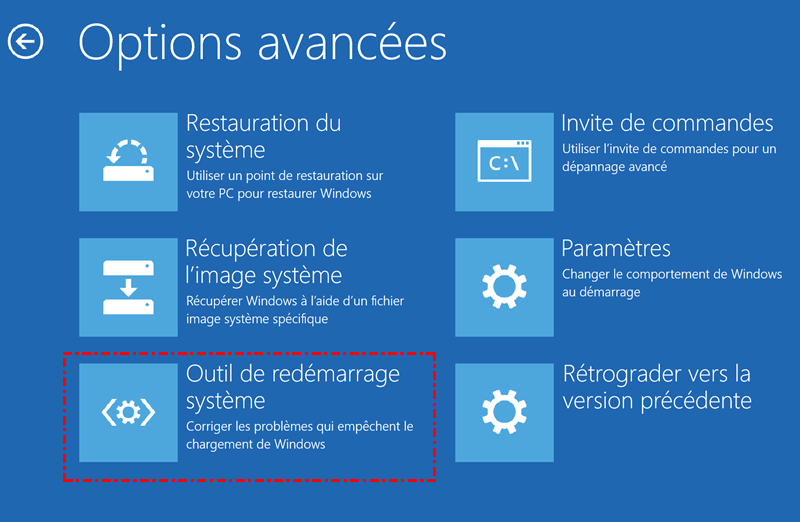 Étape 2. Windows se chargera automatiquement dans l'environnement de récupération Windows (WinRE). Choisissez ensuite « Dépannage » > « Options avancées » > « Outil de redémarrage système ».