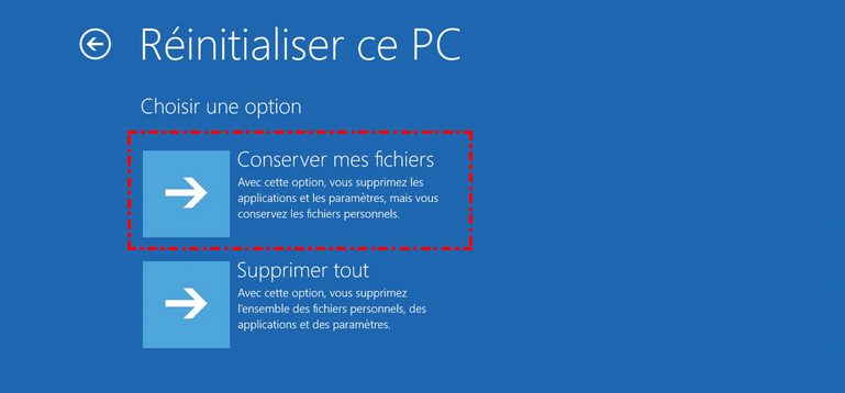 Étape 2. Choisissez « Conserver mes fichiers » pour conserver vos fichiers personnels. Sinon, tous les fichiers, applications et paramètres seront effacés.
