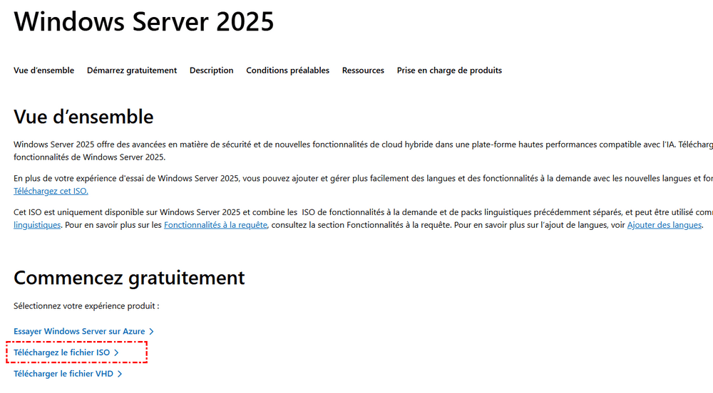 Rendez-vous sur le site web officiel de Microsoft et téléchargez le fichier ISO amorçable de Windows Server 2025. Assurez-vous d'avoir suffisamment d'espace de stockage et notez l'emplacement où vous enregistrez le fichier.